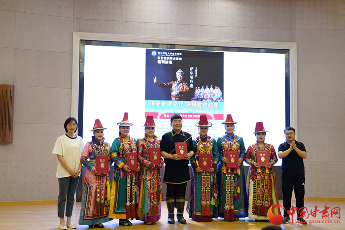 中國甘肅網(wǎng)7月1日訊 近日,甘肅裕固族歌唱組合薩爾組合主唱薩爾帶著他的裕固族伙伴們走進西北師范大學音樂學院,進行“課程思政教學實踐”——《裕固族民歌中的服飾文化》交流分享活動。同時,西北師范大學音樂學院副院長晏曉東為七位裕固族民間音樂傳播者頒發(fā)了音樂學院聘書。