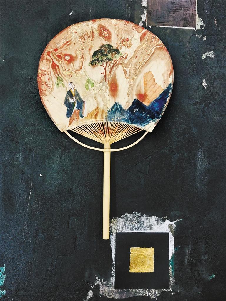 據(jù)劉志剛介紹,漆扇是使用漆藝中的“漂漆”技法,利用了漆不溶于水的特質(zhì),以點(diǎn)、甩、彈、劃等手法,在水面繪出圖案效果。這樣制作出的扇面,都是獨(dú)一無(wú)二的。