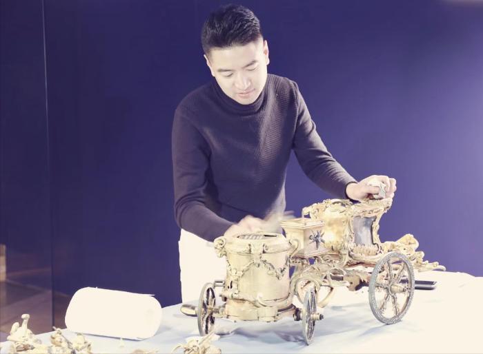 “這件‘魔術(shù)人鐘’功能比較復(fù)雜,經(jīng)過(guò)長(zhǎng)期開(kāi)動(dòng)后,出現(xiàn)了一點(diǎn)故障,就存放在了庫(kù)房。”亓昊楠說(shuō),自己和師父王津一起修復(fù)這座鐘表時(shí),才發(fā)現(xiàn)它的內(nèi)部系統(tǒng)有多精細(xì)。