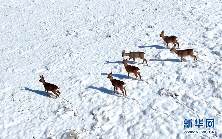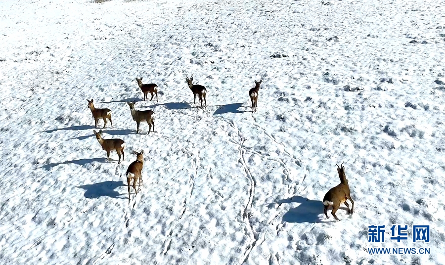 幾只狍鹿正在雪地“漫步”。新華網(wǎng)發(fā) (王曉涇 攝)