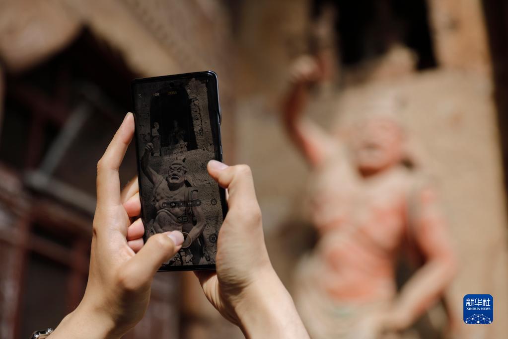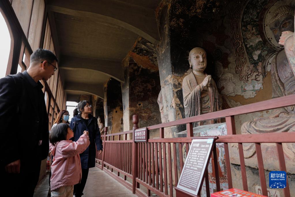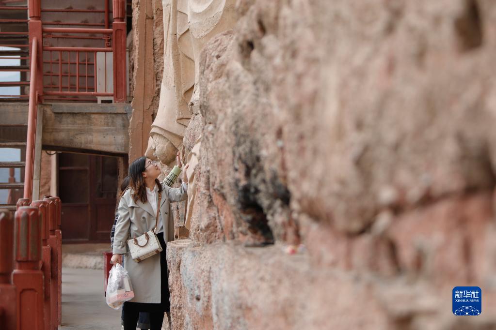 4月1日,游客在麥積山石窟參觀。新華社記者 方欣 攝