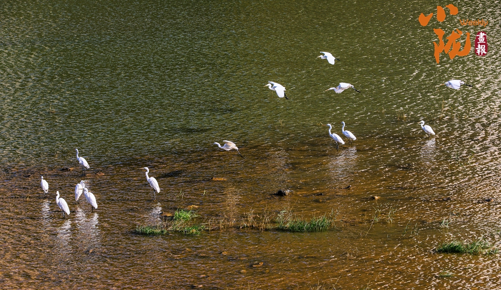 天藍(lán)、水清、田綠、樹青,成群的白鷺在子午嶺上方自由飛翔,時(shí)而在水面或河岸追逐嬉戲。