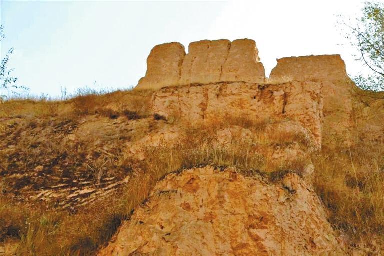 在威戎鎮(zhèn)見到的第一處遺存,是位于威戎鎮(zhèn)廣場(chǎng)后的一處臺(tái)地。這一處遺存,是一段殘破的老城墻,以及一座形似堡樓的殘?jiān)U驹谂_(tái)地之下,仰望斷墻,人工修筑的痕跡十分明顯,層層黃土夯筑,因?yàn)閺U棄殘破而長(zhǎng)滿了荒草。走近堡樓,可以看見當(dāng)時(shí)修筑時(shí)搭建木椽的孔洞,還有很多手掌大小的圓形石塊。