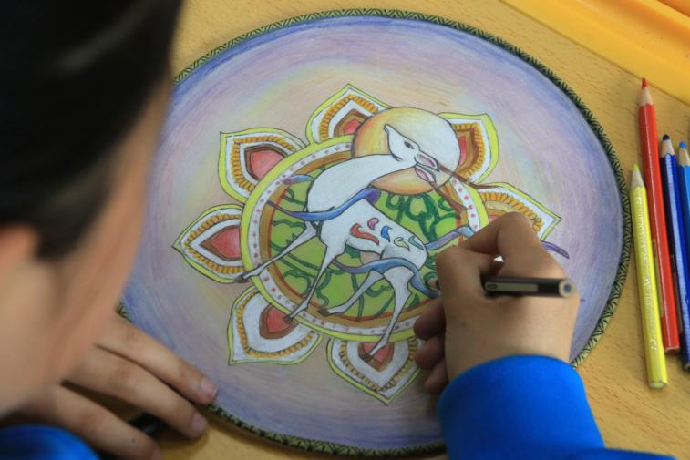 敦煌市西關(guān)小學美術(shù)社團的學生正在為帶有敦煌壁畫元素的團扇畫圖上色。張曉亮 攝