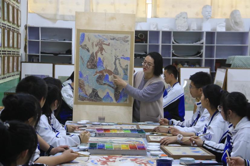 敦煌中學美術(shù)教師楊娜為學生講解敦煌壁畫藝術(shù)。張曉亮 攝