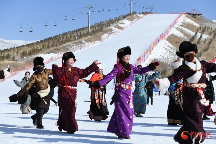 銀裝素裹的“冰雪嘉年華”現(xiàn)場,來自當(dāng)?shù)氐母刹咳罕娚碇?jié)日的盛裝和游客們一起,隨著音樂的旋律,跳起了鍋莊。游玩區(qū),大人小孩參與其間,體驗雙板滑雪、雪圈、雪地自行車等多種娛樂項目,歡聲笑語彌漫著整個雪場。