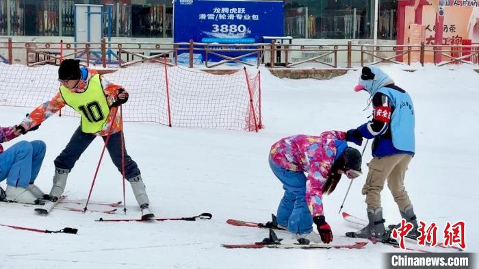 圖為滑雪教練協(xié)助臺胞青年進行滑雪訓練。王牧雨 攝