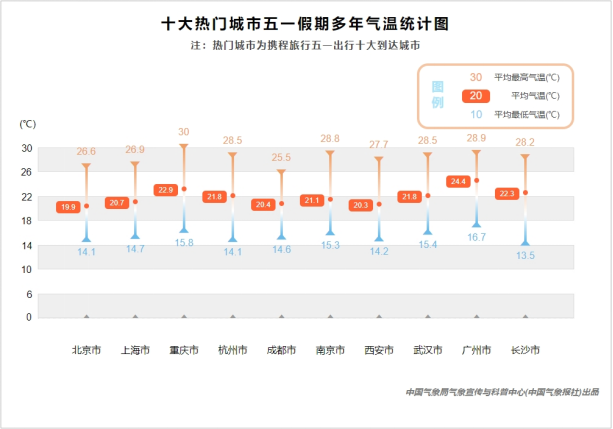 南北方熱門城市“五一”假期的氣溫差異并不大,都非常適宜出行,最高氣溫均在25℃以上。重慶是唯一一個在“五一”期間平均最高氣溫達(dá)到30℃的熱門城市,熱度與溫度都在高位,前往還需注意防暑降溫。