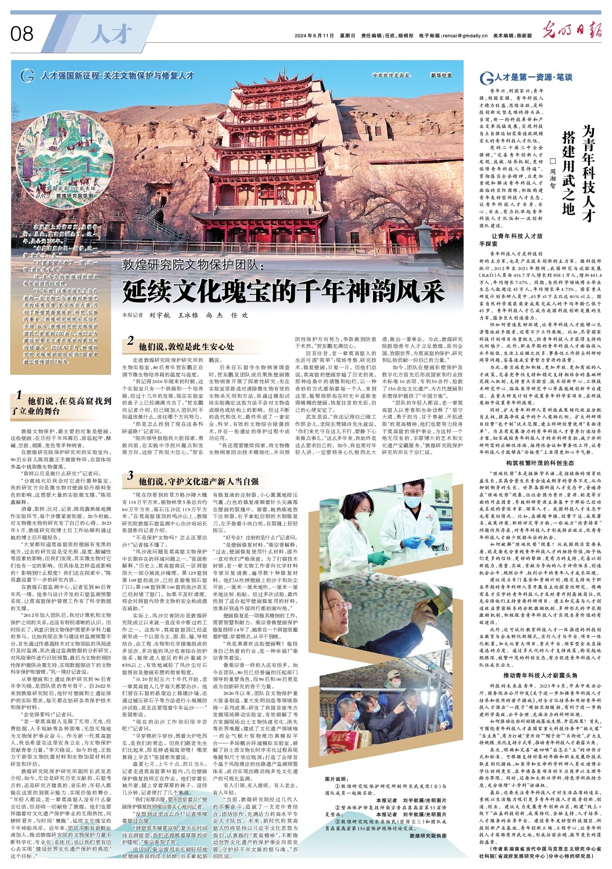 敦煌研究院保護(hù)研究所副所長(zhǎng)武發(fā)思介紹,如今,無(wú)論是研究歷史文獻(xiàn)的、石窟考古的,還是研究古建筑的、音樂(lè)的,年輕人都能在這里找到展示能力、實(shí)現(xiàn)價(jià)值的舞臺(tái),“年輕人都說(shuō),老一輩莫高窟人沒(méi)有什么豪言壯語(yǔ),但卻將一切獻(xiàn)給了敦煌。他們也要懷揣著對(duì)文化遺產(chǎn)保護(hù)事業(yè)的無(wú)限熱忱,向榜樣看齊,與時(shí)間‘賽跑’,延續(xù)文化瑰寶的千年神韻風(fēng)采。近年來(lái),團(tuán)隊(duì)不斷有新鮮血液加入,推動(dòng)敦煌研究院的文物保護(hù)力量不斷科學(xué)化、專(zhuān)業(yè)化、系統(tǒng)化,也讓我們更有信心去實(shí)現(xiàn)‘建設(shè)世界文化遺產(chǎn)保護(hù)的典范’這個(gè)目標(biāo)。”