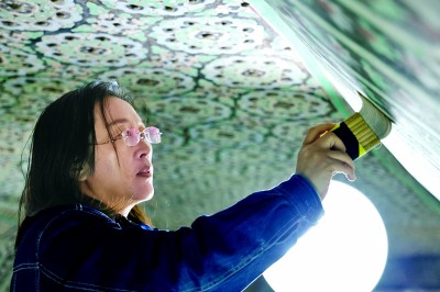 壁畫(huà)修復(fù)是一項(xiàng)極其精細(xì)的工作,需要智慧和耐力。柴宗香做壁畫(huà)保護(hù)修復(fù)技師14年了,她常在一個(gè)洞窟里戴著護(hù)膝,穿著棉衣,從早干到晚。