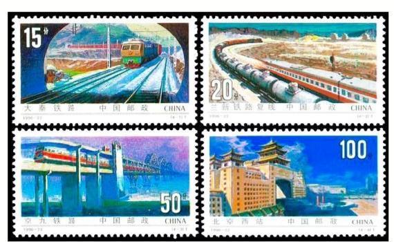 1996年9月,我國(guó)發(fā)行編號(hào)為1996-22的《鐵路建設(shè)》郵票一套四枚,其中T4-2圖為蘭新鐵路復(fù)線。票面上,一貨一客兩列火車蜿蜒在蘭新鐵路復(fù)線,氣勢(shì)如虹。而嘉峪關(guān)關(guān)城作為一個(gè)地理標(biāo)志,被處理成蘭新鐵路復(fù)線的背景圖案,放在郵票主圖的后方。盡管由于票面所限,背景圖案上的嘉峪關(guān)關(guān)城畫面很小,無以淋漓盡致地表現(xiàn)嘉峪關(guān)城樓的細(xì)節(jié),但其“天下第一雄關(guān)”的雄姿絲毫不減。而嘉峪關(guān)出現(xiàn)在表現(xiàn)甘肅特色乃至蘭新交通主線的票面上,也足見其地理位置的重要性。