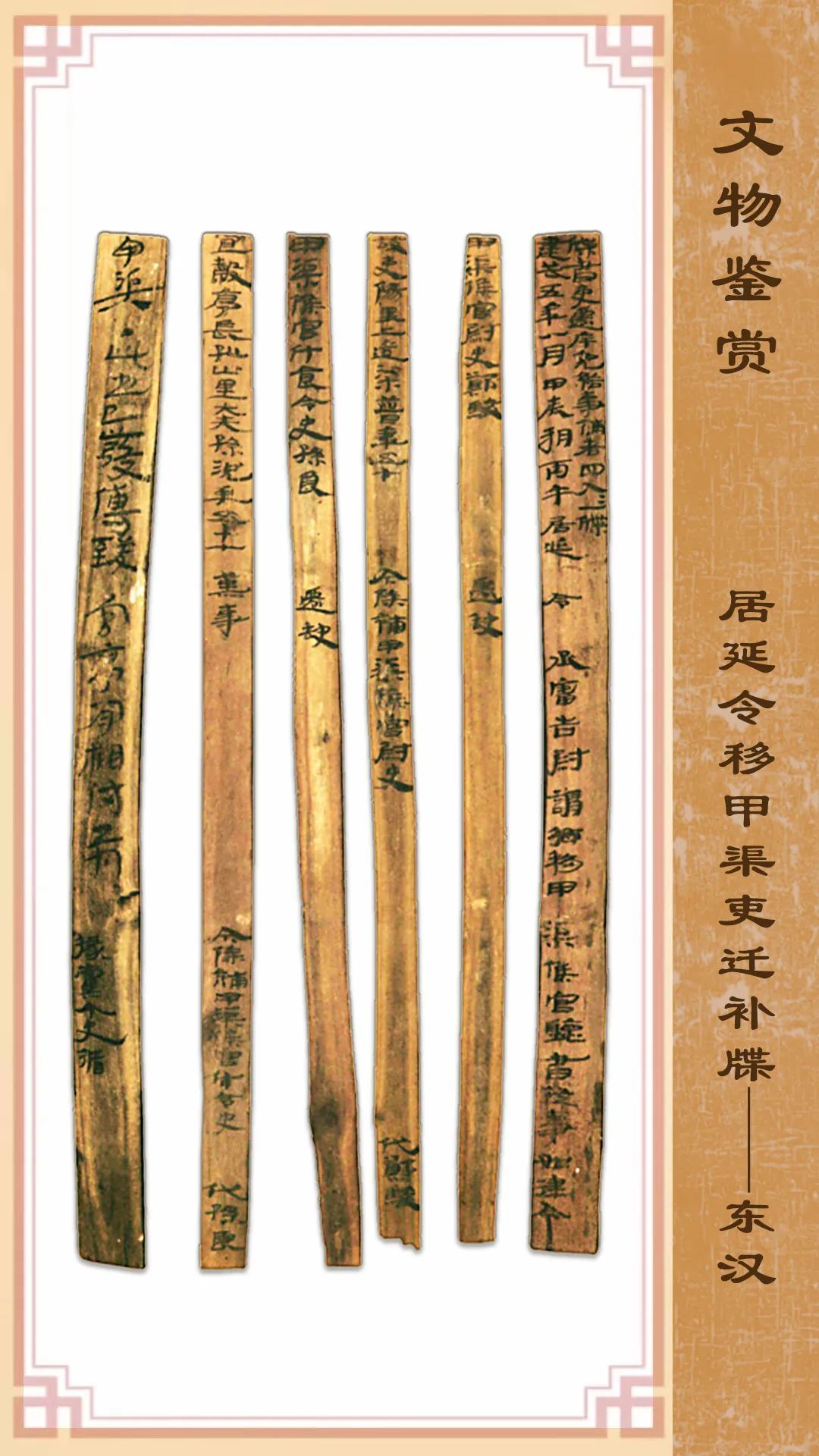 第一簡文字為:“牒書:吏遷、斥免、給事補者四人,人一牒。建武五年八月甲辰朔丙午,居延令 丞審告尉:謂鄉(xiāng)移甲渠候官,聽書從事,如律令。”這是文件的標題和行文要求。“居延令”之后尚留空白,說明這是一份還未正式生效的官員任免文件。其他4簡則是此次任免人員和崗位的具體內(nèi)容。在簡牘背面書有此文件的起草人掾黨和令史循二人,屬于共同署名。該文書對了解漢代基層吏員的任免、除補等基本程式有重要參考價值?,F(xiàn)藏甘肅簡牘博物館。