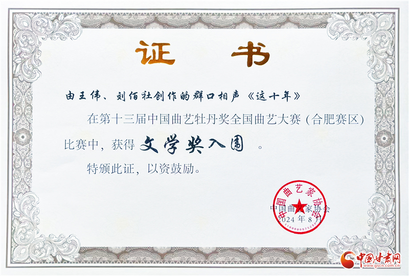 甘肅本土群口相聲《這十年》獲第十三屆中國(guó)曲藝牡丹獎(jiǎng)文學(xué)和節(jié)目雙入圍獎(jiǎng)