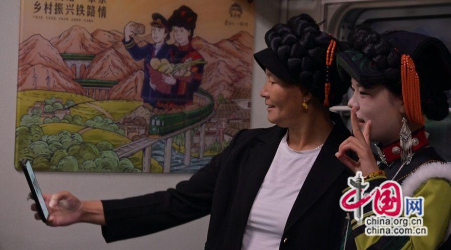 沿途,每當(dāng)列車停靠在車站等待的時間,彝族老鄉(xiāng)在鐵路工作人員的協(xié)同配合下搬起水果,牽起牛羊,抱起雞鴨放進(jìn)一節(jié)節(jié)行李車廂上,慢火車的貨架上擺滿了農(nóng)產(chǎn)品。車廂里,人們互相交談,圍坐在一起放聲歌唱,好不熱鬧,歡樂的聲音從車廂內(nèi)傳出,像是在向廣袤的山川大地宣告著彝歷新年的盛事。