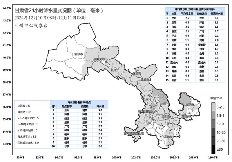 中國甘肅網(wǎng)12月11日訊(西北角·中國甘肅網(wǎng)記者 沈文剛)12月10日8時(shí)至12月11日8時(shí),全省共計(jì)62個(gè)縣區(qū)出現(xiàn)小雪,其中蘭州主城區(qū)出現(xiàn)大雪,慶陽北部、白銀中部和北部、臨夏西南部出現(xiàn)中雪。較大降水量出現(xiàn)在蘭州本站5.0mm、靖遠(yuǎn)3.5mm、環(huán)縣3.5mm、景泰2.9mm、廣河2.7mm。