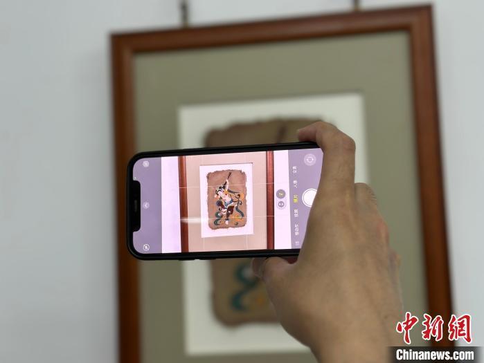 12月17日,由蘭州市七里河區(qū)委宣傳部、七里河區(qū)文體旅局聯(lián)合舉辦的“大漠孤陽(yáng)映彩霞 敦煌神韻美如畫(huà)”新時(shí)代文明實(shí)踐主題活動(dòng)暨敦煌巖彩畫(huà)書(shū)畫(huà)藝術(shù)展拉開(kāi)帷幕。圖為參觀者拍攝展出的“反彈琵琶”題材巖彩畫(huà)。楊娜 攝