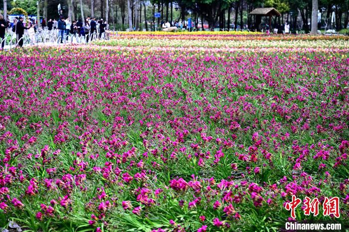 3月16日,游客在公園觀賞小蒼蘭。春日,福州花海公園魯冰花、小蒼蘭、油菜花等鮮花盛放,吸引了許多民眾前來漫步賞花,享受春天美好時光。中新社記者 張斌 攝