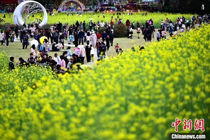 3月16日,游客在公園觀賞彩色油菜花。春日,福州花海公園魯冰花、小蒼蘭、油菜花等鮮花盛放,吸引了許多民眾前來漫步賞花,享受春天美好時光。中新社記者 張斌 攝