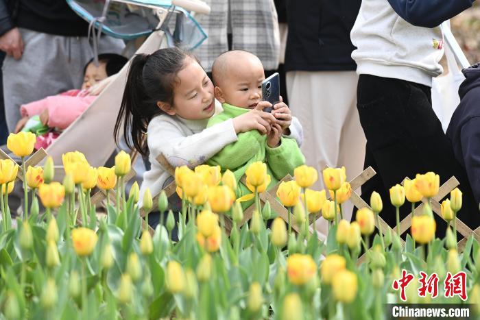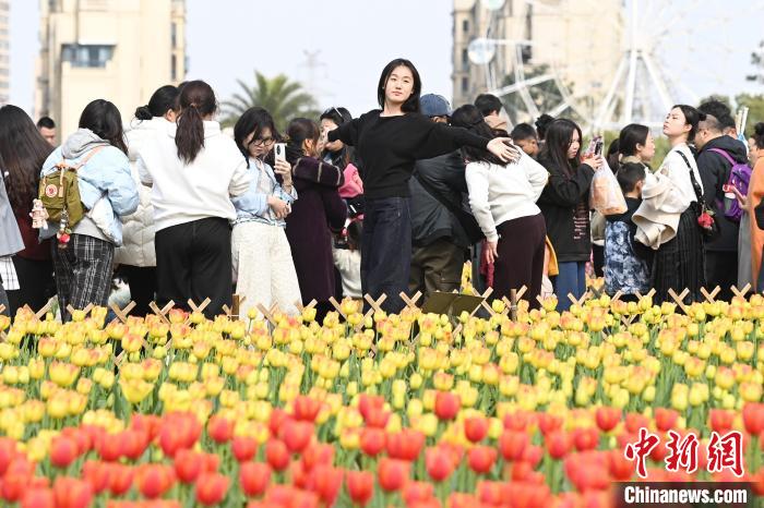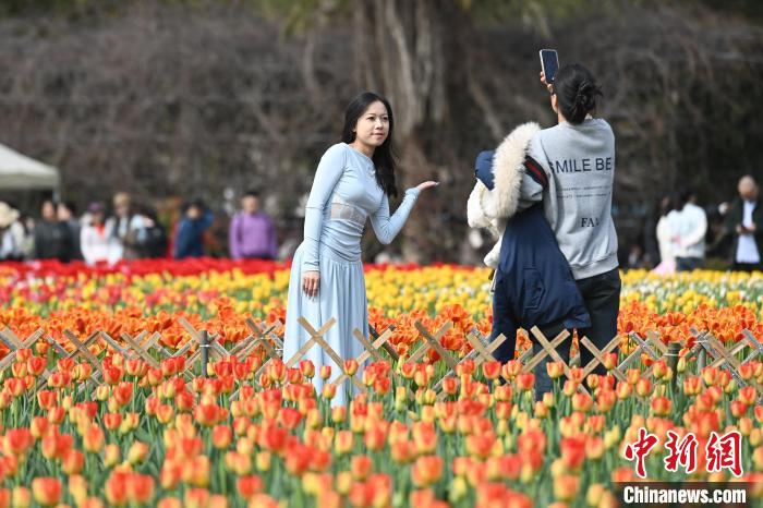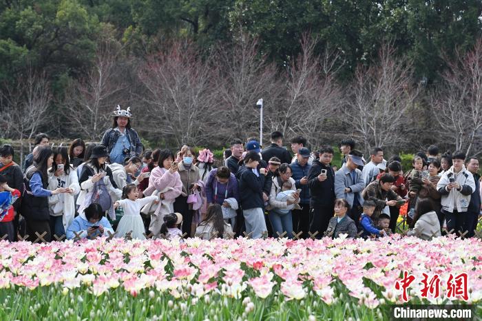 3月16日,位于湖南長(zhǎng)沙的湖南省植物園數(shù)十萬株郁金香肆意綻放,五彩斑斕的花瓣交織成一片絢麗花海,引得眾多游人紛至沓來,享受愜意春日。圖為游人置身花叢中。中新社記者 楊華峰 攝