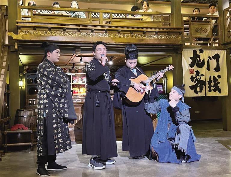 “諸位小友近來可好?”“好!”在街區(qū),NPC們與游客的互動(dòng)成為一大亮點(diǎn)。為了讓游客更好地沉浸其中,街區(qū)里的“蘭裳閣”專門提供服裝出租和妝造設(shè)計(jì)服務(wù)。游客們在這里換上漢服、做好造型,“穿越”成古人與NPC們共同沉浸在這場歷史旅行中。張偉彥在“龍門客棧”工作快半年了,飾演店小二馬一刀。他對角色有著自己的理解:“導(dǎo)演讓我演店小二,大家印象里店小二都是機(jī)靈、腿腳快的。但我演的這個(gè)店小二帶著江湖氣息,他藏在龍門客棧,其實(shí)是個(gè)刀客,在這里打工是為了打探消息,畢竟龍門客??墒墙⒌木奂亍?rdquo;記者走在街區(qū),時(shí)不時(shí)就能看到他拿著草帽,熱情地招呼游客玩接帽子游戲。遇到靦腆不敢嘗試的游客,他也會(huì)不斷鼓勵(lì),有時(shí)候碰上外國游客,他還隨口說幾句英語與其互動(dòng)。