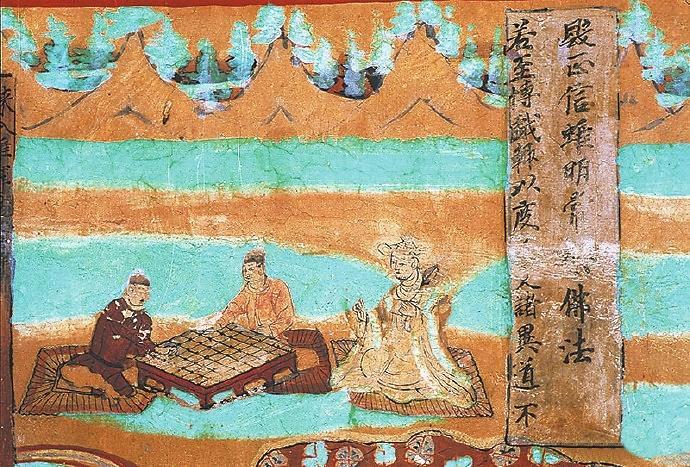 在敦煌壁畫中有關(guān)對(duì)弈的內(nèi)容較多。在莫高窟第454窟、第7窟壁畫中都有“弈棋圖”。兩幅圖的畫面有不少類似的地方:一是畫師較為突出棋盤的位置,兩幅壁畫中的棋盤都居中且形制相對(duì)巨大;二是畫面上的人物均為三人,兩人對(duì)弈,一人觀戰(zhàn),“觀棋不語(yǔ)真君子”;三是對(duì)弈者身后的景色都是天朗氣清、遠(yuǎn)山含黛。據(jù)說,一天,北宋大文豪蘇東坡與摯友黃庭堅(jiān)正在松樹底下弈棋。一陣風(fēng)吹來(lái),松果掉進(jìn)棋盤。蘇東坡隨即吟道:“松下圍棋,松子每隨棋子落。”黃庭堅(jiān)馬上回答道:“柳邊垂釣,柳絲常伴釣絲懸。”雅趣十足。其實(shí),棋局里的一動(dòng)一靜、一招一式無(wú)不需要謹(jǐn)小慎微、穩(wěn)扎穩(wěn)打。而對(duì)弈時(shí)的當(dāng)斷則斷、示假隱真、有效合作等戰(zhàn)術(shù)不僅是對(duì)弈的智慧,也是人生的哲理吧。