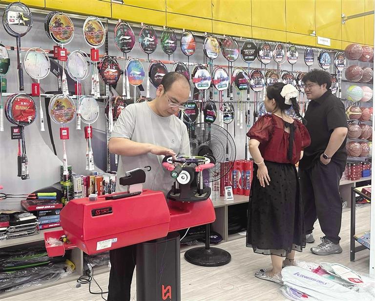 不僅如此,運(yùn)動(dòng)用品銷售也迎來小高峰。瑞德摩爾太平洋商場(chǎng)內(nèi)的健雄體育用品店內(nèi),老板正忙著給羽毛球空拍穿線。“我們不僅有現(xiàn)成的羽毛球拍,還可以根據(jù)客戶的需求給空拍穿線。”該店老板介紹,羽毛球拍網(wǎng)線價(jià)位30至100元不等,購(gòu)線還可免手工費(fèi)。羽毛球初學(xué)者一般都會(huì)買成品拍自己在家練習(xí),而一些技術(shù)較好的顧客除了會(huì)選擇品質(zhì)較好的空拍,還會(huì)現(xiàn)場(chǎng)選線拉網(wǎng)定制屬于自己的球拍。“暑假以來,店內(nèi)羽毛球拍銷量大增,穿線需求也逐漸增多,周末從早忙到晚,每半小時(shí)穿一個(gè)球拍,最多一天穿24個(gè),排隊(duì)等候已成常態(tài)。”此外,不少運(yùn)動(dòng)品牌也順勢(shì)推出促銷活動(dòng),吸引消費(fèi)者選購(gòu)。