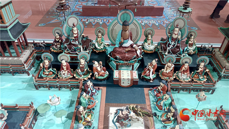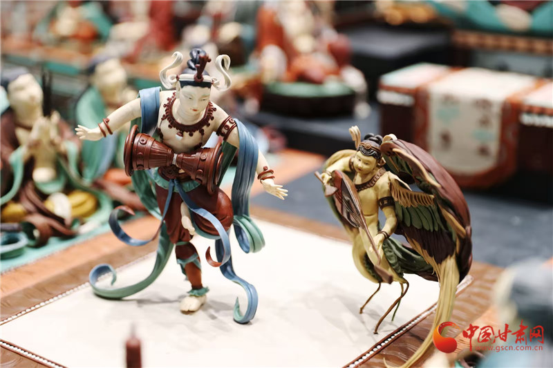 今年蘭洽會(huì)甘肅非遺館,正中央的敦煌文化題材《觀(guān)無(wú)量壽經(jīng)變》面塑受到客商全員追捧。經(jīng)過(guò)這里的人都會(huì)駐足欣賞,感受面塑藝術(shù)的精彩絕倫,其中,敦煌題材的面塑,飛天人物似乎從壁畫(huà)里飛了出來(lái),栩栩如生。