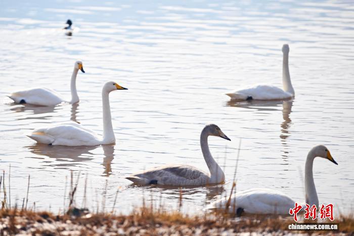 12月9日,在位于甘肅省蘭州市西固區(qū)達川鎮(zhèn)三河口濕地,從西伯利亞而來的白天鵝嬉戲。據(jù)悉,該地屬于黃河、湟水、大通河三河交匯之處,生態(tài)環(huán)境良好,擁有1200畝蘆葦蕩。近年來,該地吸引越來越多來自西伯利亞的白天鵝選擇在此停歇棲息。中新社記者 李亞龍 攝