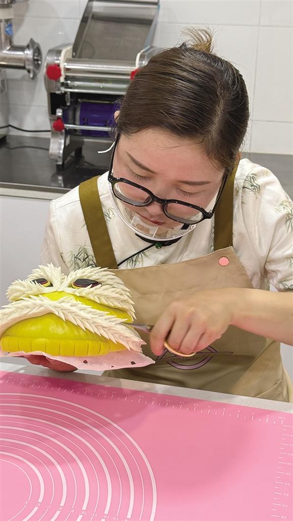 走進(jìn)楊曉蘭的花饃小店,濃郁面香裹挾著藝術(shù)氣息撲面而來。展架上,威風(fēng)凜凜的醒獅昂首欲嘯,憨態(tài)可掬的卡通角色惹人喜愛,盤踞的靈蛇栩栩如生……此刻,她正凝神制作醒獅花饃,搓、捏、塑形,面團(tuán)在她指尖迅速呈現(xiàn)出獅頭的威武雛形。