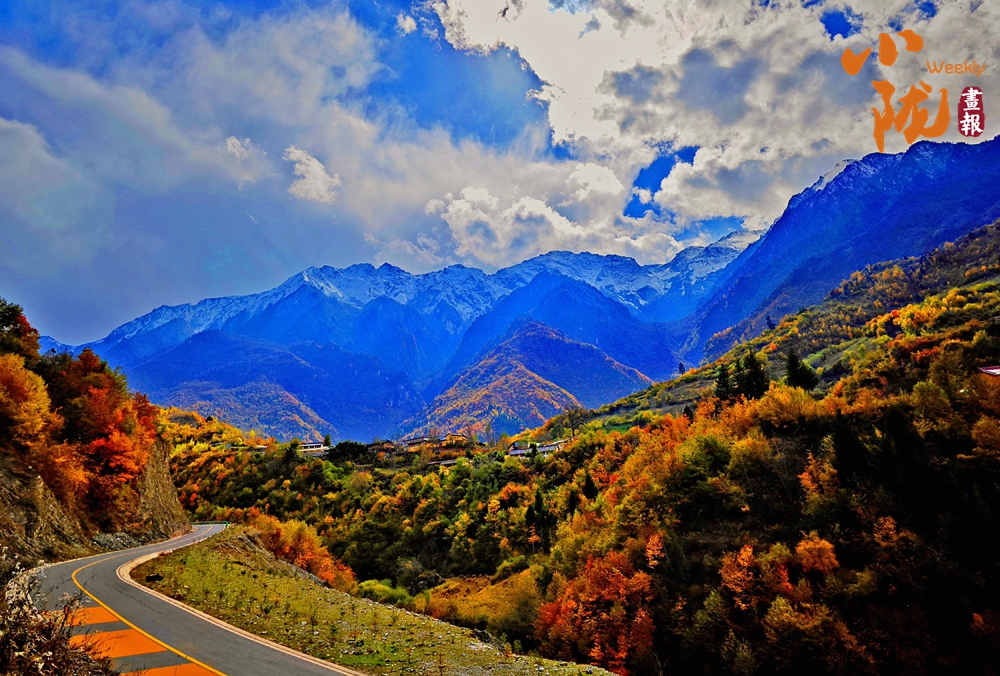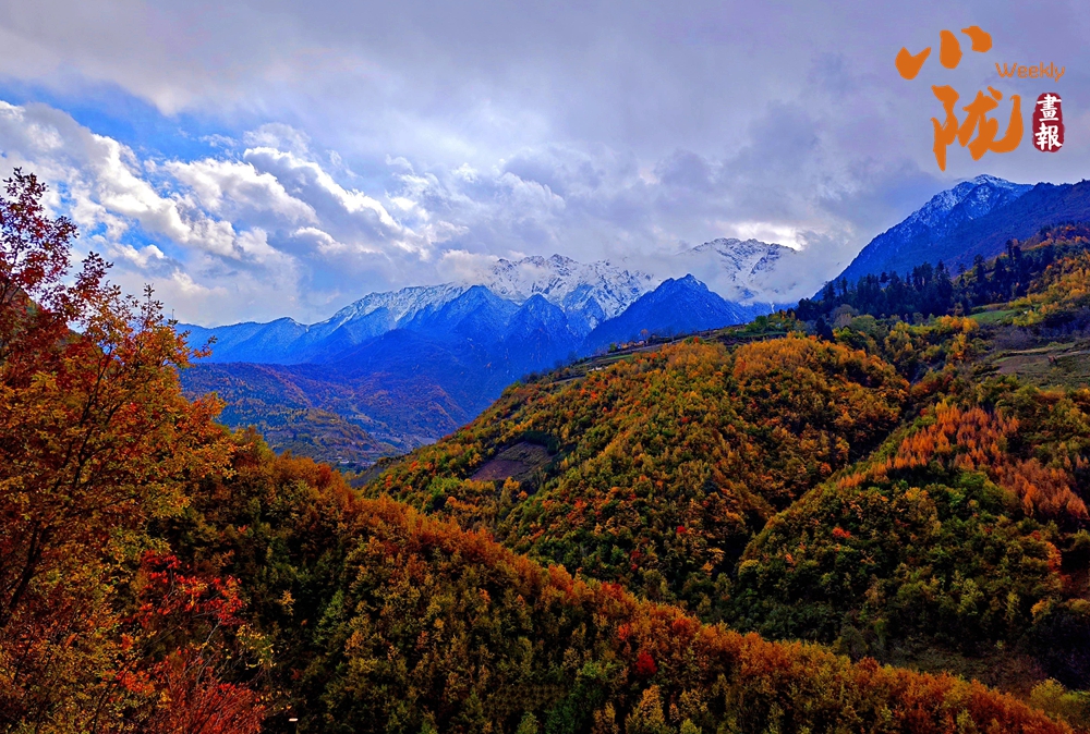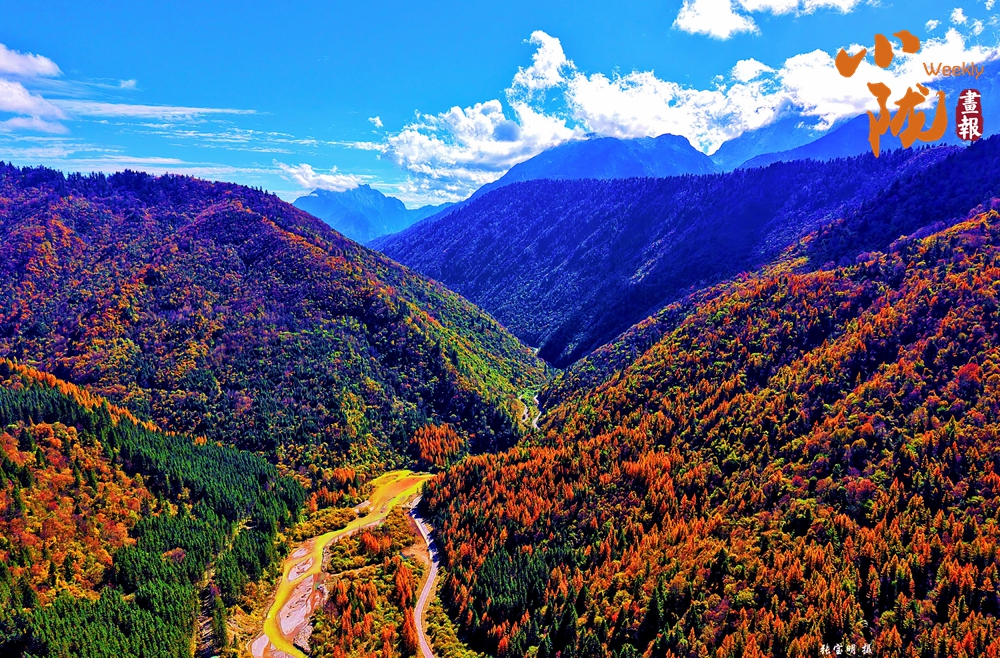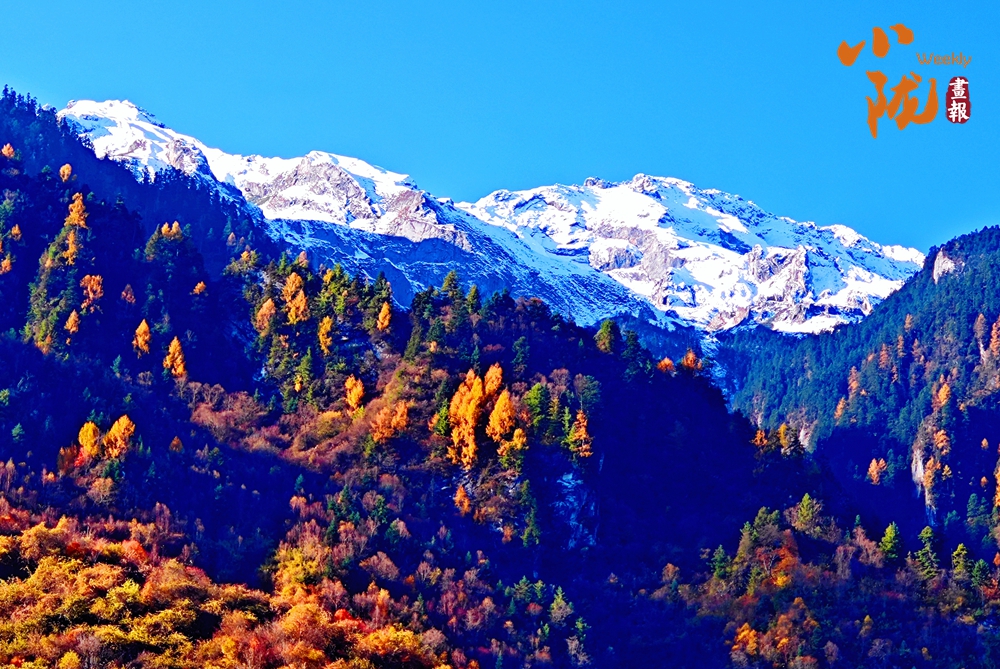 山巔的白雪與彩林形成鮮明對比,紅與黃,白與藍(lán),在陽光的映照下,共同編織出一幅溫柔而夢幻的畫卷。