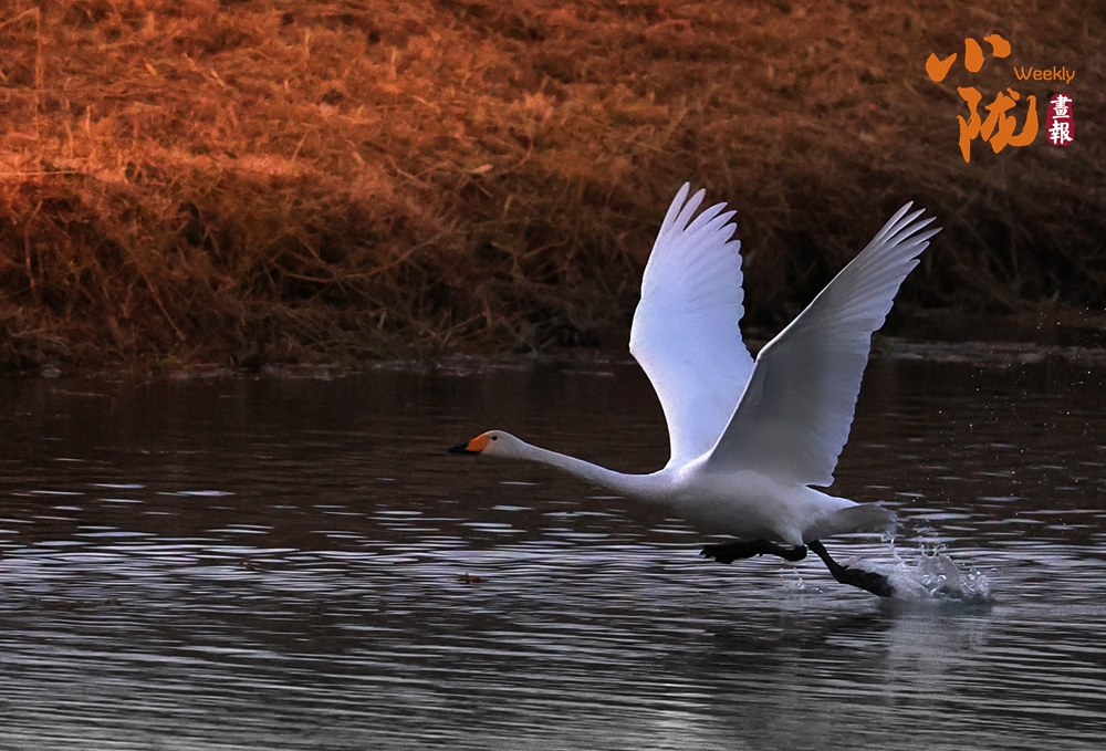落日余暉傾灑,野生白天鵝頭頂紅冠鮮艷奪目,于這片天地優(yōu)雅振翅、覓食。