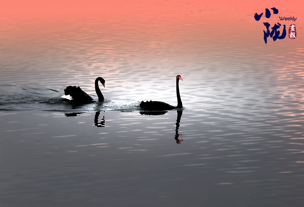 水面平靜如鏡,野生黑天鵝舒展雙翼,揚(yáng)著頸脖,在水中游弋劃波,時(shí)而低頭覓食,時(shí)而相互依偎,成雙成對上演冬日浪漫。