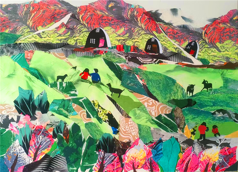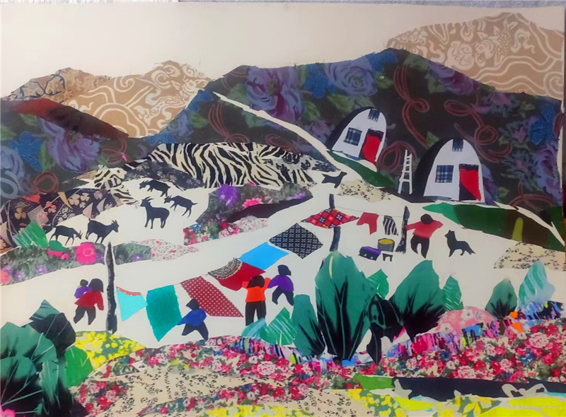 裁剪環(huán)節(jié)更見功力。她以“銳利”之心駕馭剪刀,根據畫面需求將碎布剪成不同形狀,有的需棱角分明,有的要圓潤柔和。粘貼時,她摒棄簡單的粘合方式,采用傳統(tǒng)縫補與現代鑲嵌相結合的技法,讓布料與底板緊密貼合,既保證了作品的耐久性,又營造出自然的浮雕感。在《黃土風情》布貼畫中,她用層層疊疊的碎布表現黃土高原的溝壑縱橫,用深淺不一的色塊勾勒窯洞的錯落有致,指尖翻飛間,碎布頭便有了筋骨與神韻。