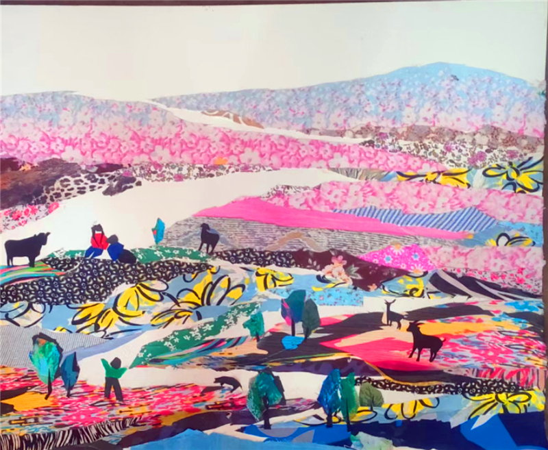 張銳利的布貼畫,始終扎根于隴東大地的文化土壤。她的作品多以黃土高原為背景,窯洞、田野、籬笆、勞作的農人都是常見元素,每一幅都透著濃郁的生活氣息。她善于捕捉布料本身的特質與畫面意境的契合點:用褪色的舊粗布表現老農的皺紋,用鮮亮的碎花布點綴村姑的衣裳,用厚實的帆布塑造石碾的厚重。那些看似雜亂無章的碎布頭,經過她的篩選、裁剪、拼接,仿佛被賦予了生命,在畫布上演繹著隴東人的生活百態(tài)與黃土高原的雄渾之美。