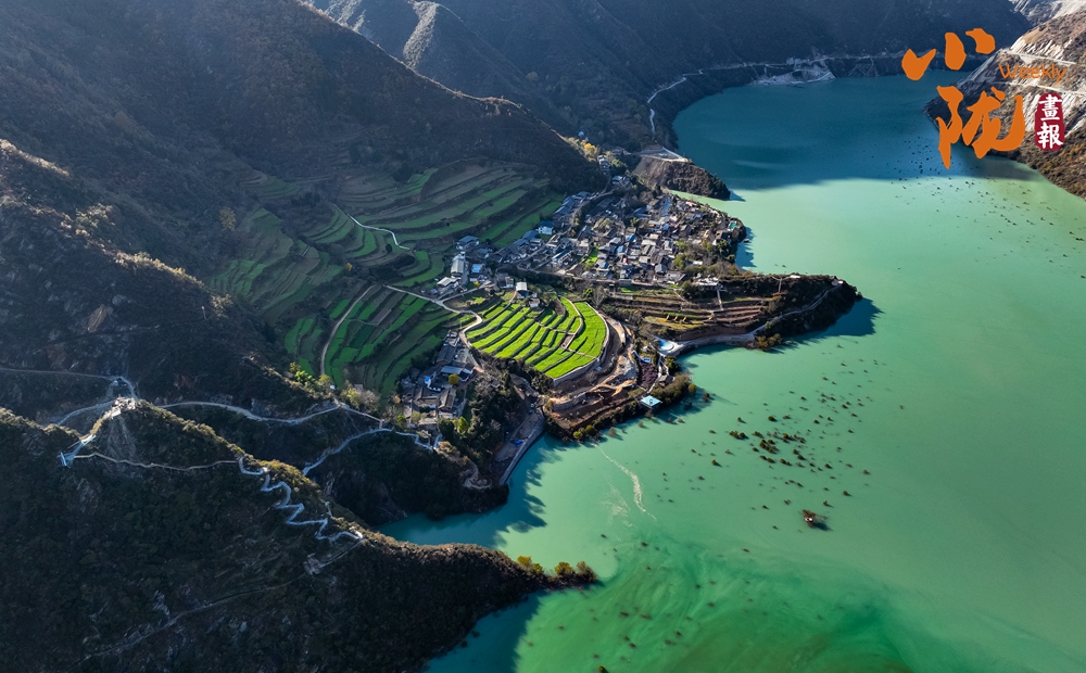 和煦的陽光傾灑而下,白龍江凝結(jié)的冰面宛如一塊巨大的天然翡翠,溫潤而晶瑩。它并非孤立存在,而是以一種寧靜而包容的姿態(tài),溫柔地環(huán)繞著、守護(hù)著岸上那些升起炊煙的村舍。