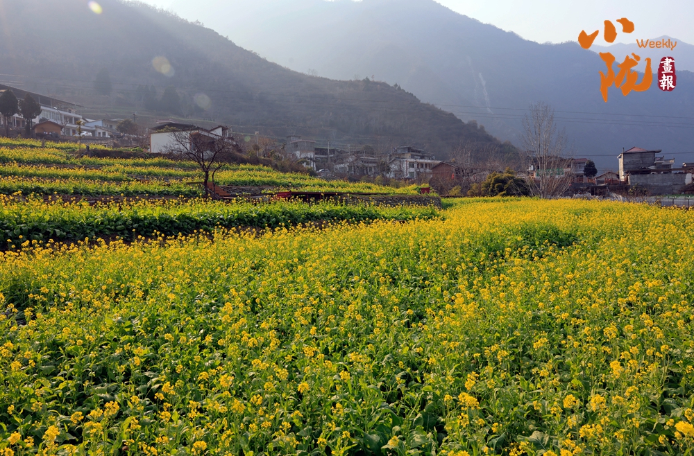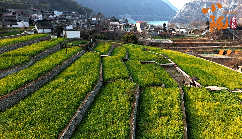 那一叢叢、一簇簇的油菜花,沿著梯田層層疊疊,從江邊一直蔓延到半山腰,鋪展在青山碧水之間;又像是大地剛剛蘇醒時(shí),打翻的調(diào)色盤。
